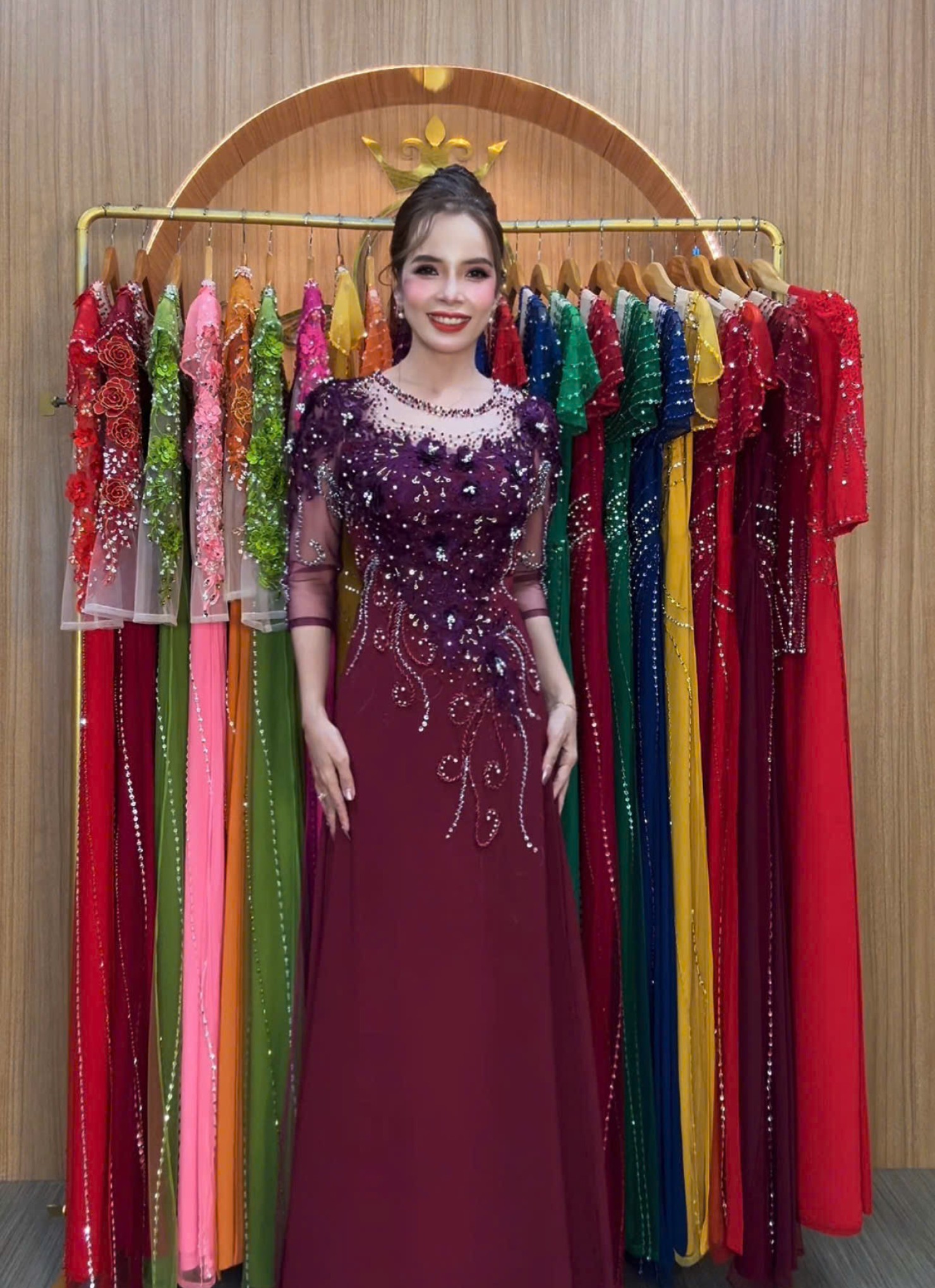 + Đường kim mũi chỉ nét từng cen-ti-mét, đi cùng khâu kết đá pha lê đẹp kiêu sa
